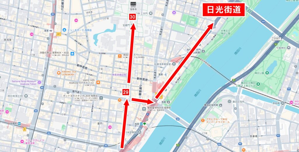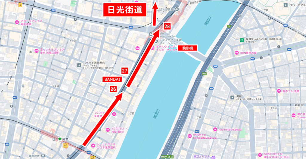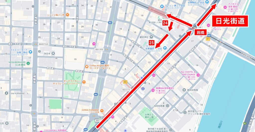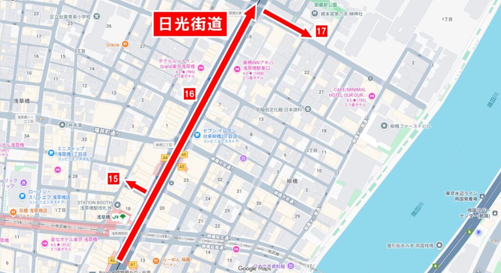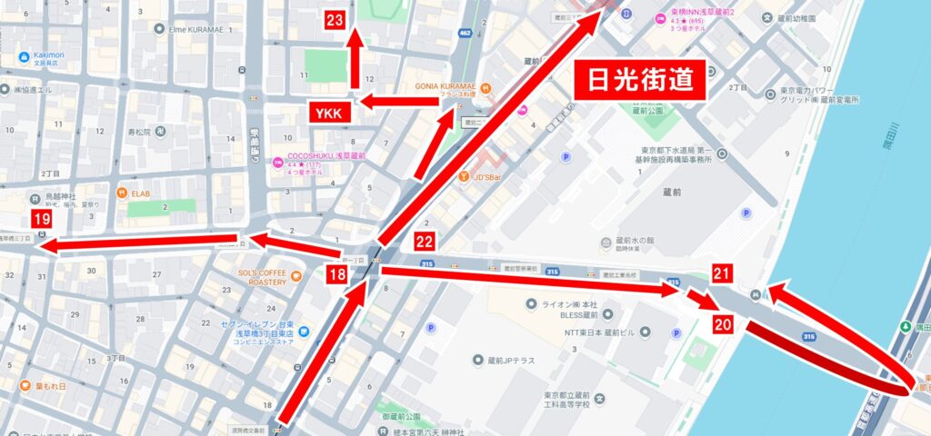 鳥越神社の参拝を終えたら、来た道を引き返し、日光街道を越えて直進、隅田川に架かる蔵前橋方面へ進みます。