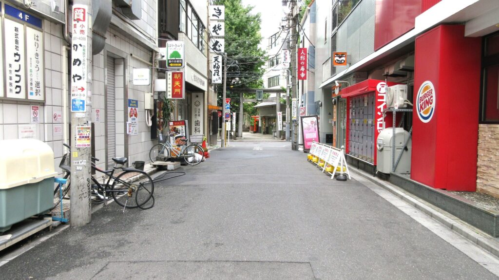 正面突き当りに見えている鳥居が、目的地「銀杏岡八幡神社」です。