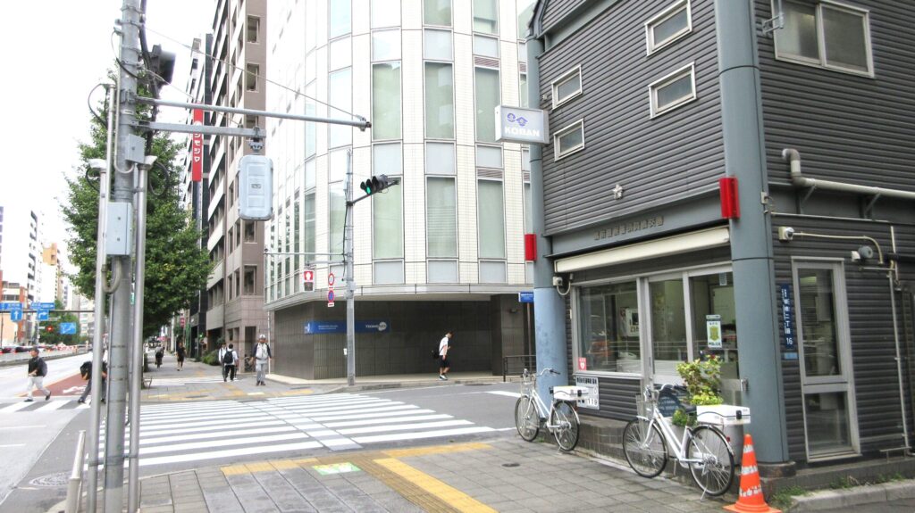 さらに真っすぐ進んで行くと、右側に交番のある交差点があります。
