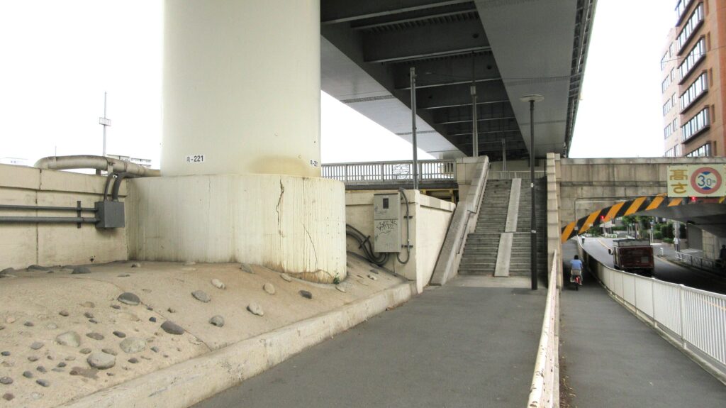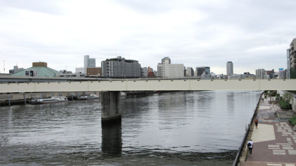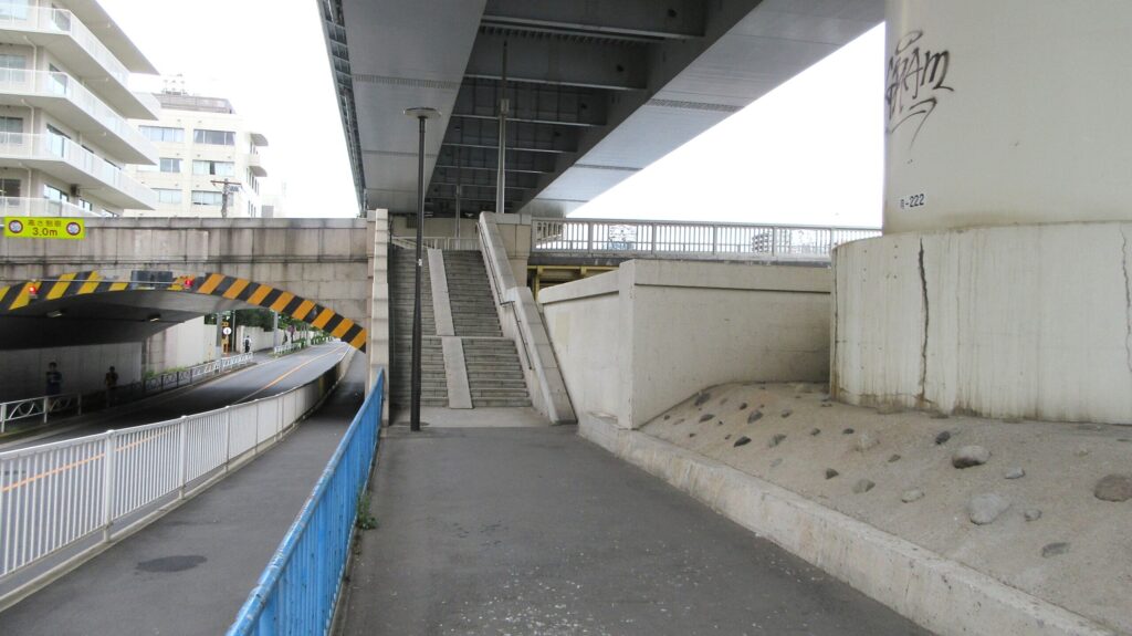 隅田川の東岸へ渡ったら、右側に階段がありますのでそこを降りて、橋の下をくぐって反対側の階段を上って再び蔵前橋を戻ります。