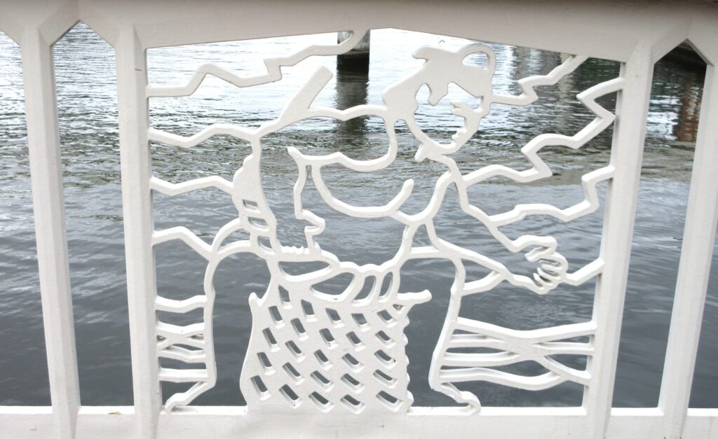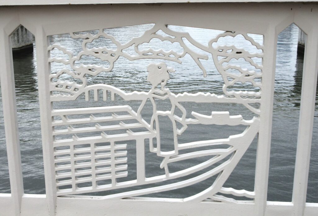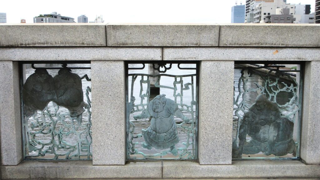 蔵前橋の欄干には、さすが「蔵前」だけあって、お相撲さんがデザインされていたり、屋形船に佇む着物姿の女性がデザインされていたりと、これを見るだけでも楽しいですね。