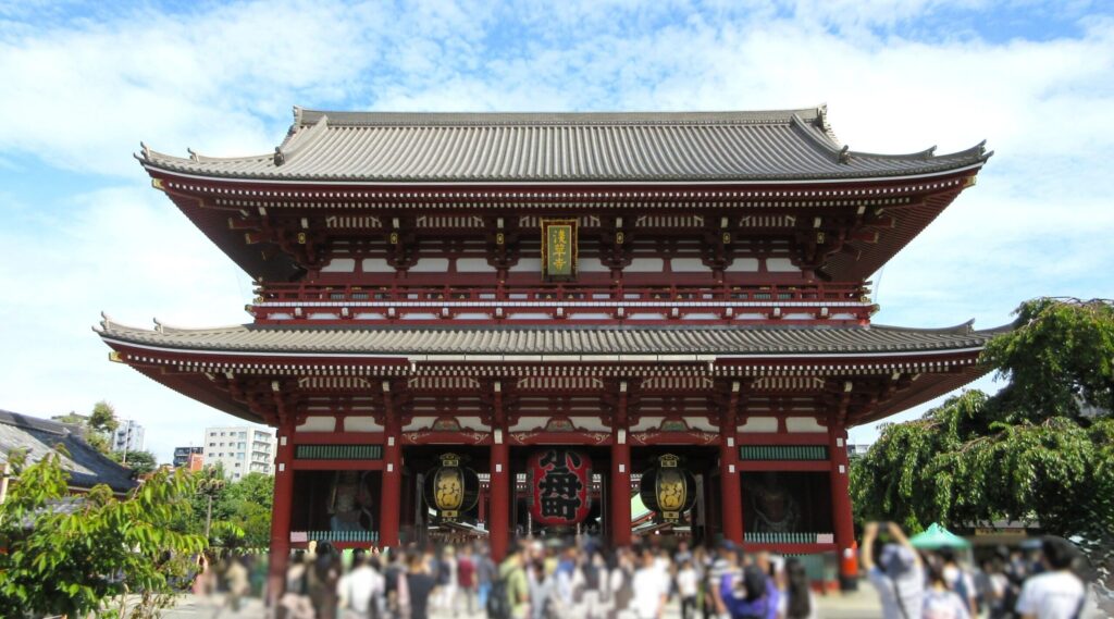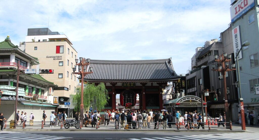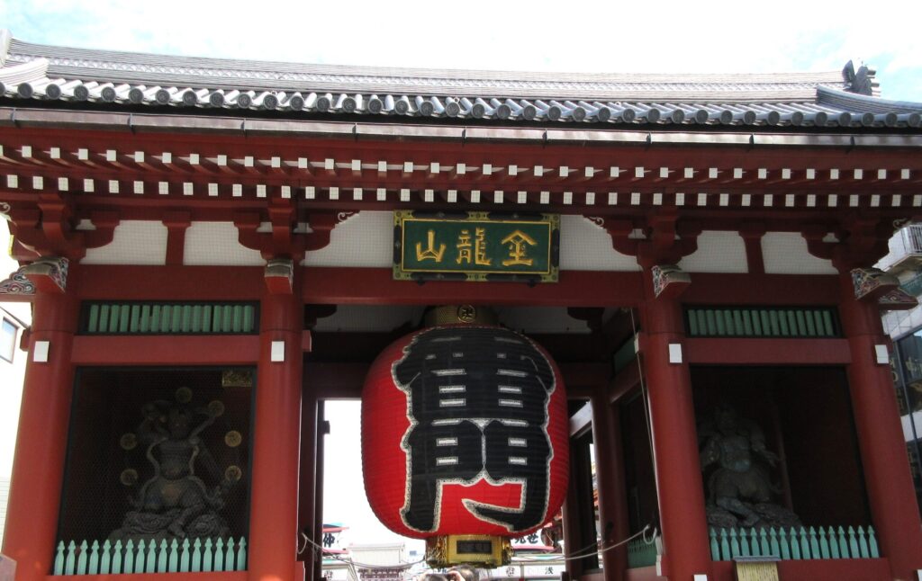 浅草寺の表参道に立つ象徴的な門で、正式名は「風雷神門(ふうらいじんもん)」です。