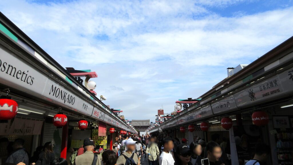 記念撮影をする外国人観光客にもみくちゃにされながら、人と人との間をすり抜けて門をくぐると、目の前には左右に所狭しとお店が立ち並ぶ「仲見世」です。
