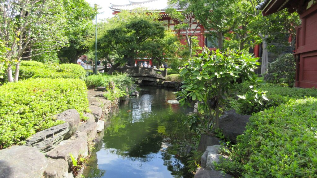 境内は美しく日本庭園風に整備されていて、池には鯉が泳ぎ、細長く広がる池には石造りの橋が架かっており、特に外国人観光客には絶好のフォトスポットのようでした。