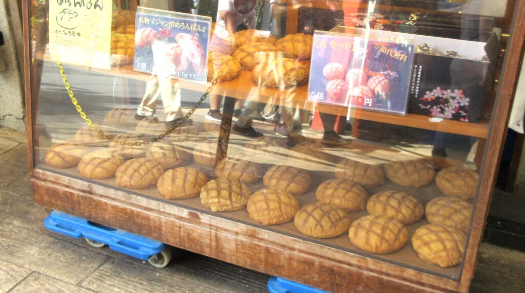 商店街の入り口付近にある小さなお店ですが、ショーケースにレトロなジャンボメロンパンがずらりと並んでいて、お店の前では美味しそうにメロンパンを頬張る外国人観光客が大勢いました。
